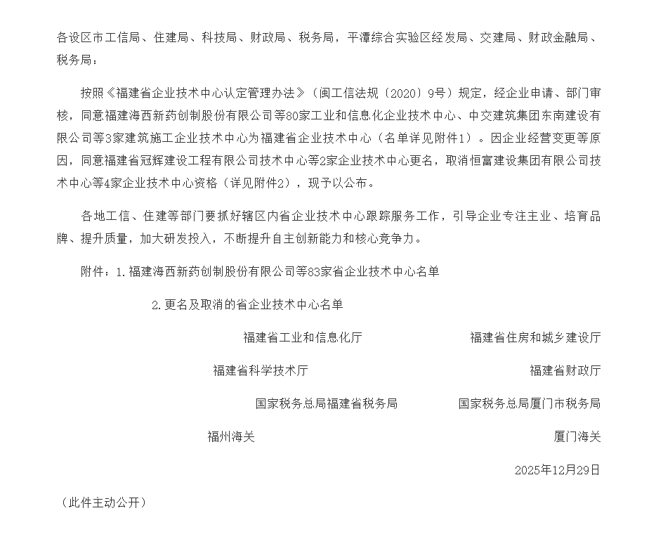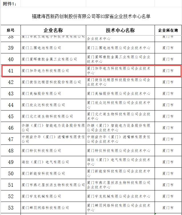 Xiamen Jiahua Electric Power Technology Co., Ltd. has been selected as a Provincial Enterprise Technology Center. In accordance with the provisions of the "Measures for the Administration of the Recognition of Fujian Provincial Enterprise Technology Centers," and following enterprise applications and departmental reviews, the Provincial Department of Industry and Information Technology, together with seven other departments, recently announced the list of Fujian Provincial Enterprise Technology Centers. A total of 83 enterprises were selected, and the Enterprise Technology Center of Xiamen Jiahua Electric Power Technology Co., Ltd. was among them.